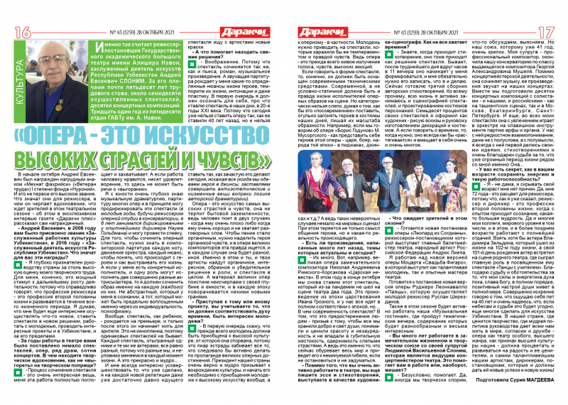 В начале октября Андрей Евсеевич был награжден нагрудным знаком «Мехнат фахрийси» («Ветеран труда») I степени фонда «Нуроний». И это не первое его высокое звание. Что значат они для режиссера, в чем он черпает вдохновение, что ждет зрителей в этом театральном сезоне - об этом в эксклюзивном интервью газете «Даракчи плюс» рассказал сам награжденный.