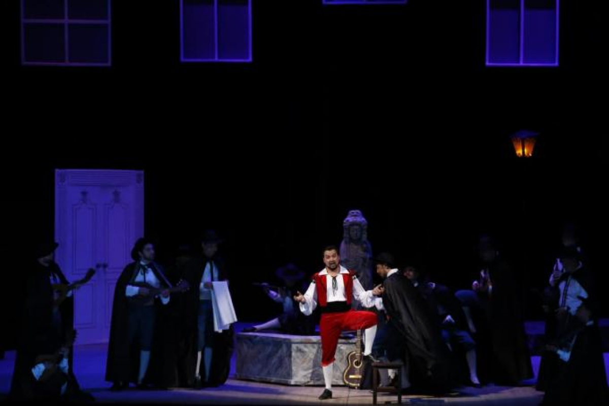 Наконец, открывается внутренний занавес в виде ширмы и перед взором распахивается ночная площадь в Севилье. Около фонтана во внутреннем итальянском дворике собрались музыканты. Граф Альмавива (народный артист Узбекистана Нормумин Султанов, лирический тенор, в своём привычном амплуа - романтик до мозга костей), влюблённый в воспитанницу доктора – Розину. Ведущая солистка ГАБТ им. А. Навои Анжелика Мухаметзянова в этой роли зажигательная и весёлая непоседа.  Граф Альмавива поёт своей возлюбленной сердечную серенаду. Но Розина не появляется на балконе… Впереди зрителей ожидает много интригующих моментов: опера в двух действиях (трех картинах) длится 2, 5 часа, но, как известно, «счастливые часов не наблюдают».